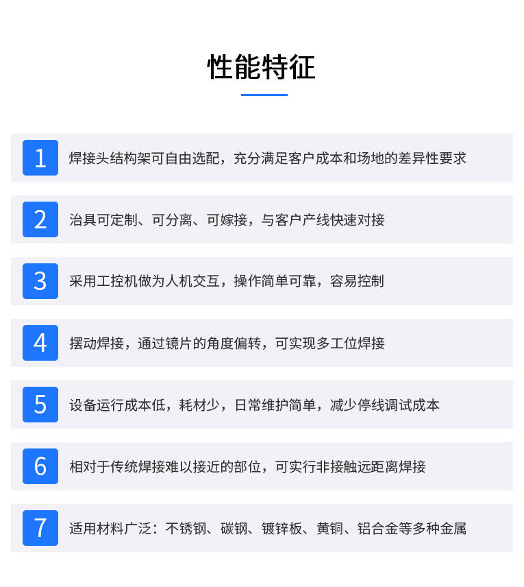 2、強大的PC控制,易于編程、調試和維護。可完成自動或半自動的點焊、對接焊、疊焊、密封焊,針對復雜的平面直線、圓弧及任意軌跡的焊接。